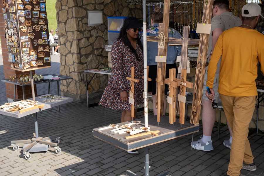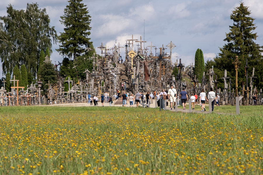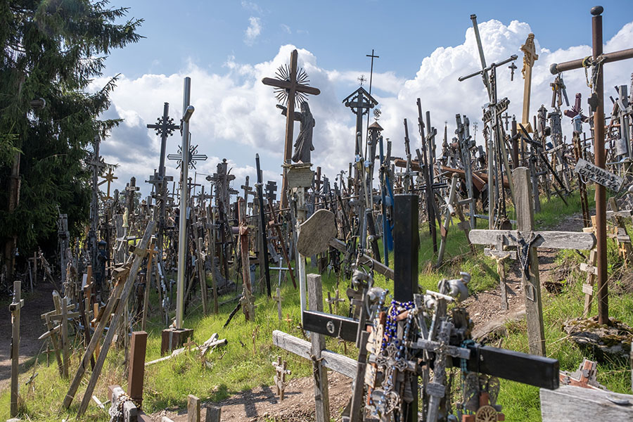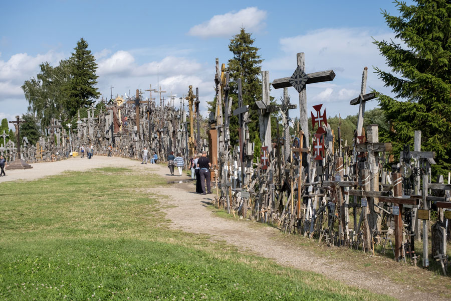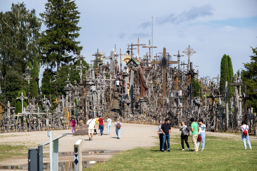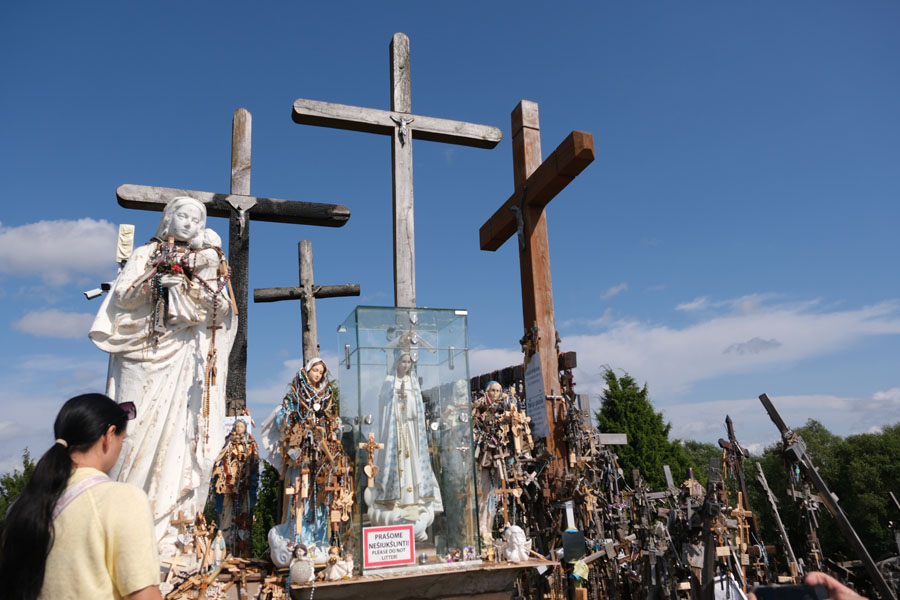 国境を越えてクライペダに向かう途中で「十字架の丘」に立ち寄る。墓地でも宗教施設でもなく、ロシア帝国の支配に抵抗して十字架が立てられ、賛同者が現れて数が増えた。ロシアは何度も撤去を試みたがその都度復活し、やがて誰でも勝手に十字架を立てられる観光地になった。入口の土産物屋で小さい十字架を売っていたが、無宗教の小生はパス。