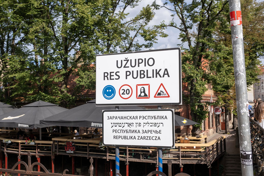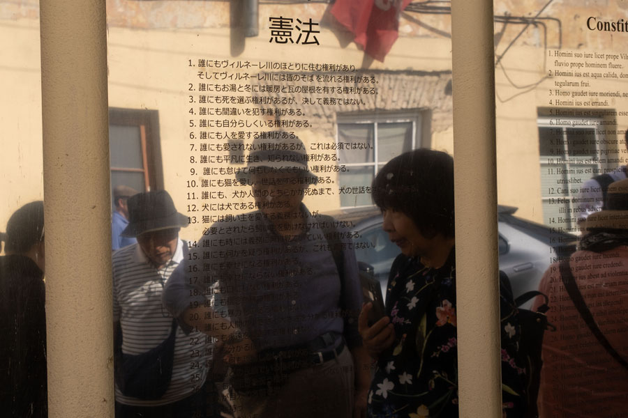 旧市街の一画に「ウジュピス共和国」と呼ばれる一風変わった地区がある。1997年に独立共和国を宣言し、独自の憲法を掲げて大統領官邸もあるが、国家として公認されたわけではない。ここに住む芸術家たちの、自由を謳歌する一種の遊びと考えてよいのだろう。メインストリートに全41条の憲法を各国語に訳したパネルが掲げられ、日本語版もある。なかなか含蓄があるので、31条から最終41条までを引用して、バルト三国の旅の総括とする。