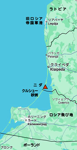 我々のクライペダ滞在の目的は、バルト海に長く伸びるクルシュー砂洲の観光。全長98kmの砂洲の北側52kmがリトアニア領で、南側の46kmはロシア飛び地のカリーニングラード州に属する。カリーニングラードは元はポーランド領だったが、ナチスドイツが領有し、第二次大戦のポツダム協定でソ連の飛び地になった。州都は人口50万の大都市で、Googleの写真地図を見ると大規模な港湾施設があり、軍港らしい雰囲気もある。ちなみに日露戦争のバルチック艦隊が発進した軍港は少し北のラトビアのリアバーヤで、写真地図を拡大すると昔の軍港の痕跡がある。我々は日本から15時間の空の旅にウンザリしたが、バルチック艦隊は7ヵ月の航海に疲れはて、戦意喪失していたのかもしれない。