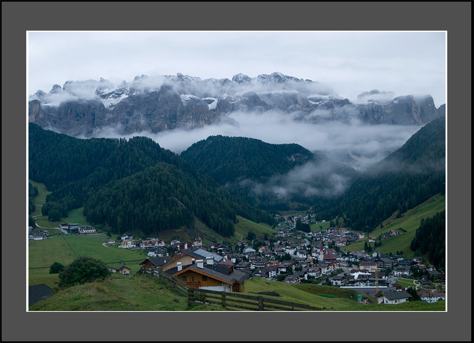 南チロルにはドロミテ特有のマグネシウム性石灰岩の岩山に囲まれた「絵にかいたような」美しい村があちこちにある。コルチナ・ダンペッツオは写真1枚で通り過ぎたが、前日に泊まったサンタ・クリスチナで、早起きして朝食前に近くの村で早朝の風景を撮った。
