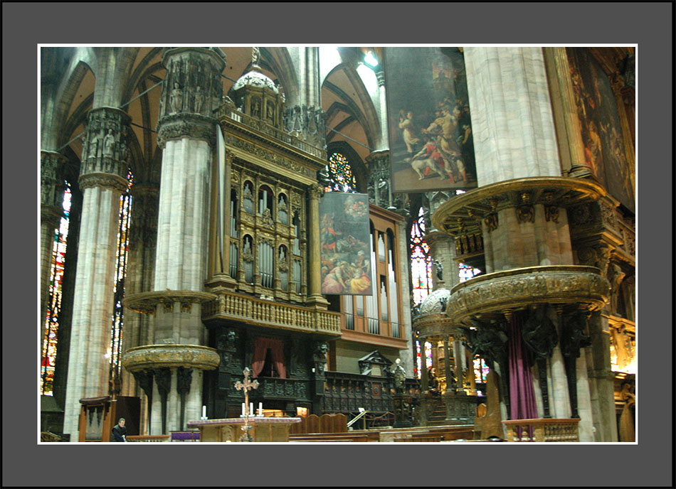 1386年から500年をかけて完成した世界最大級のゴシック建築で、設計にレオナルド・ダ・ヴィンチが係わり、ナポレオンが完成させた。第二次大戦で連合軍が爆撃を避け、破壊を免れた。135本の尖塔に聖人が立つ精緻な外観に息を呑むが、堂内の高い天井とステンドグラスに囲まれた壮麗な大空間にも圧倒される。
